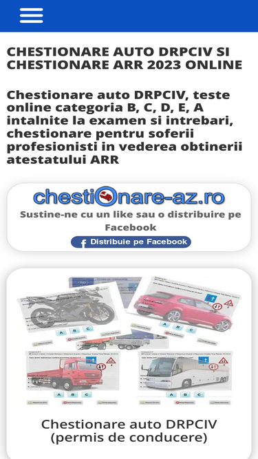 Chestionare Az .Ro. Rezolva testele auto pentru a termina cu bine scoala de soferi si a obtine permisul de conducere. Chestionare categoria a b c d e, drpciv, examen permis auto 2019, chestionare atestate profesionale online, intrebari conducatori auto marfa persoane taxi, transport agabaritice. Chestionare auto drpciv online categoria a,b,c,d,e intalnite la examenul auto; Chestionare auto drpciv 2021 exact ca la sala, ✅ teste online gratuite cu explicatii detaliate pentru categoria b, c, d, e, a si redobandire pentru a promova examenul auto din prima incercare. Receives about daily unique visitor.