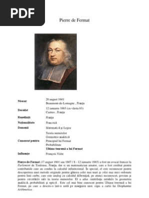 vizitati articolul complet aici : 2 Luand cazul particular cand este numar prim (si schimbam in ) avem si conditia este echivalenta ( fiind prim) cu , deci obtinem ca pentru orice cu. Numele ei provine de la pierre fermat. Prin urmare teorema enunţată de fermat, sună cam aşa: